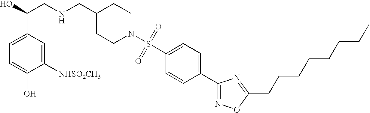 More recently, potent and selective human β3 agonists have been described in several patents and published applications: WO 98/32753, WO 97/46556, WO 97/37646, WO 97/15549, WO 97/25311, WO 96/16938, WO 95/29159, European Patents 659737, 801060, 714883, 764640, 827746, and U.S. Pat. Nos. 5,561,142, 5,705,515, 5,436,257, and 5,578,620. These compounds were evaluated in Chinese hamster ovary (CHO) cells test procedures, expressing cloned human β3 receptors, which predict the effects that can be expected in humans (Granneman et al., Mol Pharmacol., 1992, 42, 964; Emorine et al., Science, 1989, 245, 1118; Liggett Mol. Pharmacol., 1992, 42, 634).