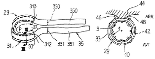 If the operation is to be made around a human aorta backwardly connected (ARR) to corporal tissues 44, as illustrated in FIG. 8, the surgeon will engage the ring 29 forwardly (referenced AVI) while opening the split 37 thereof, in particular through pulling the strap portions 350, 351, and then releasing the strength until the ring closes up around the vessel.