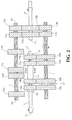 - the sense of the angle of the helical cuts develops a thrust force such that when the input shaft 1 is rotated by the prime mover, if drive helical gear pair 5 a , 5 b is engaged and mated with either driven helical gear pair 7 a , 7 b or 9 a , 9 b , drive helical gear pair 5 a , 5 b will be subjected to forces wanting to spread helical gears 5 a , 5 b apart from one another in the axial direction of input drive shaft 1 .
