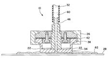 As shown in FIGS. 3 and 4, at least one piezoelectric transducer element 22 is located within the interior 49 of the megasonic lens 20, preferably adjacent to and in acoustic contact with, the faceplate 34. An electrical power source (not shown) produces electrical drive signals that are sent to the transducer assembly 12, via a signal cable 40. The electrical power source would be of a type known to one of ordinary skill in the art. The signal cable 40 carries the electrical drive signals from the power source to the piezoelectric transducer element 22. The piezoelectric transducer element 22 converts the electrical energy into mechanical energy, in the form of vibrations. For example, the electric power source may provide a 1.536 MHz electrical signal that is sent to the piezoelectric element 22, which generates an acoustic wave with a frequency of 1.536 MHz. However, as would be apparent to those skilled in the art, the invention is not limited to a specific frequency. The exemplary frequency is provided only to illustrate one preferred embodiment.