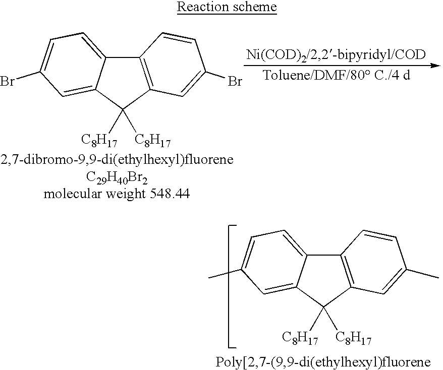 2 g of 2.7-dibromo-9.9-di(ethylhexyl)fluorene (3.64 mmol,1 equ.) dissolved in 12 ml of toluene were added at once using a syringe. After 5 minutes 0.6 ml (4.37 mmol, 1.2 equ.) of 1,5-cyclooctadiene (COD) were added and the reaction mixture was kept stirring under argon for 4 days at 80° C.