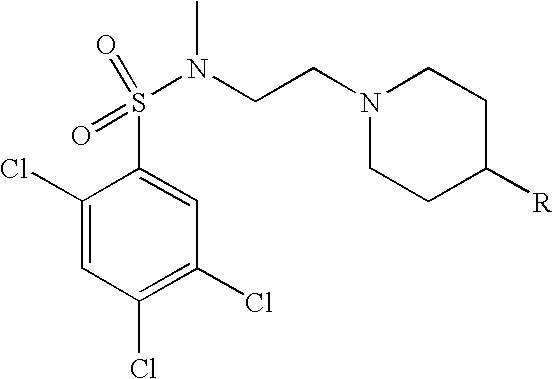 - RIVOLYNHTXSHGB-UHFFFAOYSA-N 2,4,5-trichloro-n-ethyl-3-[2-[4-(6-fluoro-1h-benzimidazol-2-yl)piperidin-1-yl]ethyl]benzenesulfonamide Chemical compound CCNS(=O)(=O)C1=CC(Cl)=C(Cl)C(CCN2CCC(CC2)C=2NC3=CC=C(F)C=C3N=2)=C1Cl RIVOLYNHTXSHGB-UHFFFAOYSA-N 0.000 claims description 2