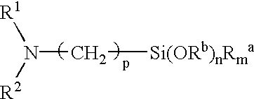 - aminoalkoxysilanes include 3-aminopropyldimethyl-methoxysilane, 3-aminopropyltrimethoxysilane, 3-aminopropyl-triethoxysilane, 3-aminopropylmethyl-dimethoxysilane 3-aminopropylmethyl-diethoxysilane, N-(n-butyl)-3-aminopropyl-trimethoxysilane, N-aminoethyl-3-aminopropylmethyl-dimethoxysilane, 3-ureidopropyltrimethoxysilane, 3-ureido-propyltriethoxysilane, N-phenyl-3-aminopropyl-trimethoxysilane, N-[(N′-2-aminoethyl)-2-aminoethyl)]-3-aminopropyltrimethoxysilane and bis (3-trimethoxy-silyl