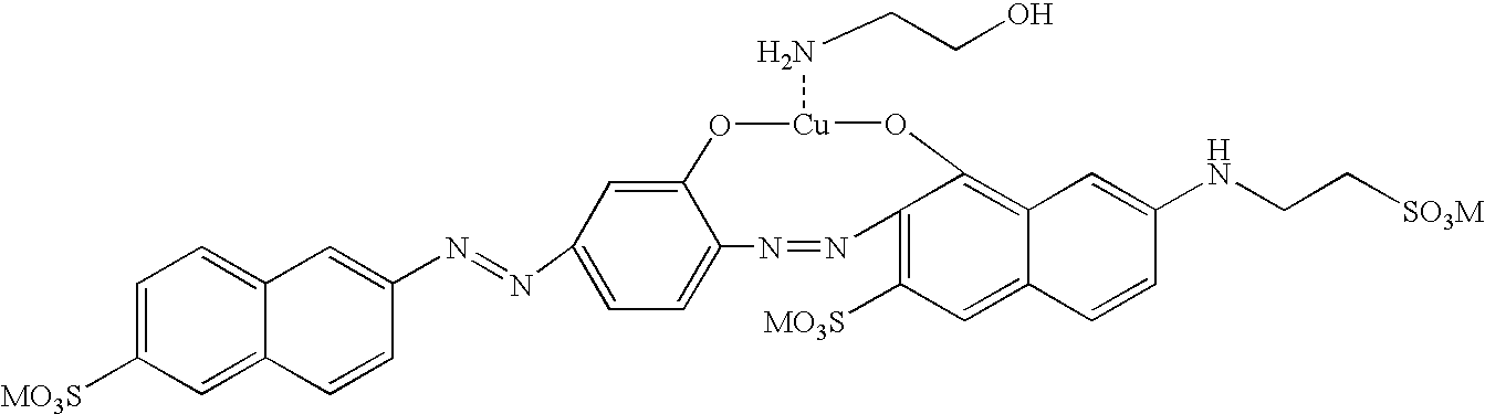Again, though any black dye load that is functional is within the scope of this embodiment of the present invention, a black dye load from 0.1% to 10.0% by weight can be used for achieving good printing results. A more preferred range includes dye loads from 2.0% to 7.0% by weight. With respect to black ink-jet inks using these and other dye loads, any ink-vehicle components can be used that are functional with the dye set forth in Formula 2. In one embodiment, the ink-vehicle can comprise from 5.0% to 50.0% by weight of at least one solvent, from 0.01% to 10.0% by weight of at least one surfactant, and water. Other vehicle components can optionally be present as well. These exemplary ink-vehicle components will be set forth more fully hereinafter.