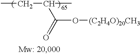 The polyoxyalkylene group can be represented by (OR)x, wherein R represents an alkylene group having from 2 to 4 carbon atoms, and preferred examples thereof include —CH2CH2—, —CH2CH2CH2—, —CH(CH3)CH2— and —CH(CH3)CH(CH3)—. In the poly(oxyalkylene) group, the oxyalkylene units each may be the same as in poly(oxypropylene), or two or more oxyalkylenes different from each other may be irregularly distributed. Furthermore, the oxyalkylene unit may be a linear or branched oxypropylene or oxyethylene unit or may be a block of linear or branched oxypropylene or oxyethylene unit. This poly(oxyalkylene) chain includes those linked through one or more linking bonds (for example, —CONH—Ph—NHCO— or —S—, wherein Ph represents a phenylene group). In the case where the linking bond has 3 or more valences, these provides means for obtaining a branched oxyalkylene unit. When this copolymer is used in the present invention, the poly(oxyalkylene) group suitably has a molecular weight of 250 to 3,000.