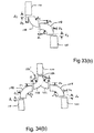 FIG. 34(a) is a plan view of a power divider formed by a trapezoidal section and pairs of concatenated bends;