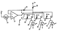 - This conventional LED drive circuitry uses ganged-type switch banks to alternately switch on/off both the input and the output of each voltage-to-current converter, thereby reducing noise from both the switching and voltage-to-current conversion circuitry.