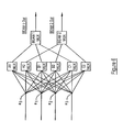 The cells are identical except for the length of the delay lines. The outputs A1, A2, B1, B2, C1, C2 of each cell are directed to the corresponding beam summation junction 155, 156, 157, 158, 159, 160, respectively, via corporate feed 161 (i.e., all A1 cell outputs are directed to A1 summation junction 155, all A2 cell outputs are directed to A2 summation junction 156, and so on). For clarity, only three feed lines corresponding to A1, A2, and C2 are shown in FIG. 16. The four signals entering A1 beam summation junction 155 are then vector summed into a single beam, and the same occurs at beam summation junctions 156, 157, 158, 159 and 160. The A1, B1, C1 junctions, 155, 156, 157, respectively, are then fed to a common beam 1 output 162. The A2, B2, C2 junctions, 158, 159, 160 respectively, are then fed to a common beam 2 output 163. The network requires no switching and is completely passive.