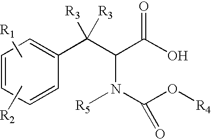 To a stirred solution of N,β,β-trimethyl-L-phenylalaninamide (0.47 g, 2.24 mmol) in 2.8 mL of acetonitrile is added 1.75 g (8.00 mmol) Boc2O. The reaction mixture is stirred for 48 hours then 27 mg (0.22 mmol) of dimethylaminopyridine and 0.43 mL (2.5 mmol) of N,N-diisopropylethylamine are added. After 24 hours, 6 mL of water is added, and the reaction mixture is washed with heptane (3×3mL). The organic layer is washed with water (3×3 mL) and brine (1×3mL) and concentrated under reduced pressure to give 1.13 g of N,N,N-tris(tert-butoxycarbonyl)-N,β,β-trimethyl-L-phenylalaninamide as a thick oil. The oil, N,N,N-tris(tert-butoxycarbonyl)-N,β,β-trimethyl-L-phenylalaninamide is taken up into tetrahydrofuran (2 mL) and treated with 5N NaOH (2 mL). The reaction mixture is stirred for 4 hours then water (4 mL) is added. The reaction mixture is filtered, washed with heptane (3×3mL), and acidified with citric acid. N-(tert-butoxycarbonyl)-N,β,β-trimethyl-L-phenylalanine (0.33 g, 41%) is obtained by extraction with ethyl acetate followed by concentration.