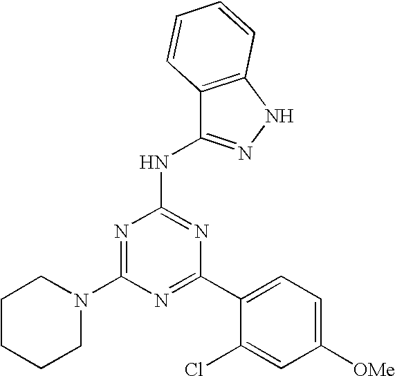 Compounds were screened for their ability to inhibit AKT using a standard coupled enzyme assay (Fox et al., Protein Sci., (1998) 7, 2249). Assays were carried out in a mixture of 100 mM HEPES 7.5, 10 mM MgCl2, 25 mM NaCl, 1 mM DTT and 1.5% DMSO. Final substrate concentrations in the assay were 170 μM ATP (Sigma Chemicals) and 200 μM peptide (RPRAATF, American Peptide, Sunnyvale, Calif.). Assays were carried out at 30° C. and 45 nM AKT. Final concentrations of the components of the coupled enzyme system were 2.5 mM phosphoenolpyruvate, 300 μM NADH, 30 μg/ML pyruvate kinase and 10 μg/ml lactate dehydrogenase.