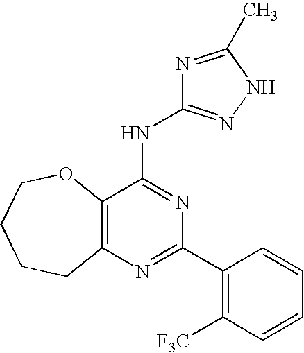 A solution of 1-chloro-3-(2-trifluoromethyl-phenyl)-isoquinoline (0.326 mmol) and 1H-[1,2,4]triazol-3-ylamine (0.651 mmol) in ethanol (3 mL) was heated at 160° C. and the solvent evaporated with a stream of nitrogen. The remaining oil was then heated at 160° C. for 18 hours under nitrogen. The resulting melt was dissolved in 5% methanol/dichloromethane (50 mL), washed with saturated aqueous sodium bicarbonate (1×25 mL) then dried over magnesium sulfate. Purification by silica gel chromatography afforded IX-175 as a colorless oil (4% yield). 1H NMR (500 MHz, CDCl3) δ 9.18 (d, 1H), 8.82 (s, 1H), 7.90 (d, 1H), 7.85-7.75 (m, 3H), 7.71-7.62 (m, 3H), 7.60-7.55 (m, 2H), 4.42-4.35 (m, 1H). LC-MS (ES+) 356.16 (M+H); HPLC-Method D, Rt 3.55 min.