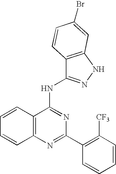 A solution of 1-chloro-3-(2-trifluoromethyl-phenyl)-isoquinoline (100 mg, 0.326 mmol) and 1H-indazol-3-ylamine (86 mg, 0.651 mmol) in ethanol (3 mL) was heated at 160 C. and the solvent evaporated with a stream of nitrogen. The remaining oil was then heated at 160 C. for 18 hours under nitrogen. The resulting melt was dissolved in 5% methanol:dichloromethane (50 mL), washed with saturated aqueous sodium bicarbonate (1×25 mL) then dried over magnesium sulfate. Purification by silica gel chromatography (25% to 50% hexane:ethyl acetate) afforded V-2 as a yellow solid (35 mg, 27%). 1H NMR (500 MHz, d6-DMSO) δ 9.78 (br s, 1H), 8.62 (d, 1H), 7.9-7.85 (m, 1H), 7.78-7.72 (m, 1H), 7.70-7.68 (m, 1H), 7.65-7.62 (m, 1H), 7.60-7.55 (m, 1H), 7.52-7.45 (m, 3H), 7.41-7.38 (m, 1H), 7.28-7.25 (m, 1H), 7.18 (s, 1H), 6.95-6.92 (m, 1H), 5.76 (s, 1H); LC-MS (ES+) m/e=405.18 (M+H); HPLC-Method D Rt 2.74 min.