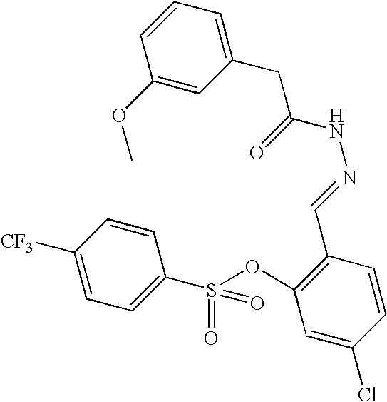 - WUGADKAHZUAUAQ-JFLMPSFJSA-N [2-[(e)-[[2-(3-methoxyphenyl)acetyl]hydrazinylidene]methyl]phenyl] 4-(trifluoromethyl)benzenesulfonate Chemical compound COC1=CC=CC(CC(=O)N\N=C\C=2C(=CC=CC=2)OS(=O)(=O)C=2C=CC(=CC=2)C(F)(F)F)=C1 WUGADKAHZUAUAQ-JFLMPSFJSA-N 0.000 claims description 5