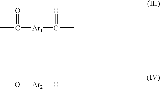 Examples of the aromatic dicarboxylic acid for the constitutive unit (III) include aromatic dicarboxylic acid such as terephthalic acid, 4,4′-diphenyl dicarboxylic acid, 4,3′-diphenyldicarboxylic acid, 4,4″-triphenyldicarboxylic acid, 2,6-naphthalenedicarboxylic acid, 1,4-naphthalenedicarboxylic acid, 2,7-naphthalenedicarboxylic acid, diphenylether-4,4′-dicarboxylic acid, diphenoxyethane-4,4′-dicarboxylic acid, diphenoxybutane-4,4′-dicarboxylic acid, diphenylethane-4,4′-dicarboxylic acid and isophthalic acid; halogen-substitution products of the aforementioned aromatic dicarboxylic acid such as chloroterephthalic acid, dichloroterephthalic acid and bromoterephthalic acid; alkyl-substitution products of the aforementioned aromatic dicarboxylic acid such as methylterephthalic acid, dimethylterephthalic acid and ethylterephthalic acid; and alkoxy-substitution products of the aforementioned aromatic dicarboxylic acid such as methoxyterephthalic acid and ethoxyterephthalic acid.