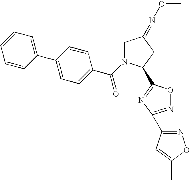 - FJWBHXLJBGWIDH-FQEVSTJZSA-N n-[[3-[(2s)-4-methoxyimino-1-(4-phenylbenzoyl)pyrrolidin-2-yl]-1,2,4-oxadiazol-5-yl]methyl]acetamide Chemical compound N1([C@@H](CC(C1)=NOC)C=1N=C(CNC(C)=O)ON=1)C(=O)C(C=C1)=CC=C1C1=CC=CC=C1 FJWBHXLJBGWIDH-FQEVSTJZSA-N 0.000 claims description 6