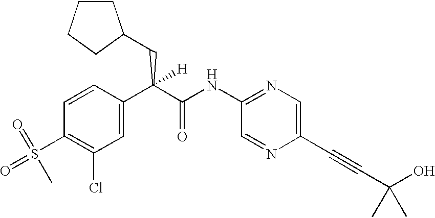 - GHHCWQQTMWLFMZ-HSZRJFAPSA-N [H][C@](CC1CCCC1)(C(=O)NC1=NC=C(C#CC2(O)CCOCC2)N=C1)C1=CC=C(S(C)(=O)=O)C=C1 Chemical compound [H][C@](CC1CCCC1)(C(=O)NC1=NC=C(C#CC2(O)CCOCC2)N=C1)C1=CC=C(S(C)(=O)=O)C=C1 GHHCWQQTMWLFMZ-HSZRJFAPSA-N 0.000 description 1