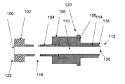 Some possible materials for the protective sheath 104 include any type of high-temperature polyimide, stainless steel, and/or silicone rubber. Alternatively, a “vanguard layer” made of polyimide with a silicone rubber outer later for kink resistance can be used in addition to or in place of the protective sheath 104. The vanguard layer is a higher temperature tougher material that does the most to protect the fibers, hence the use of the term vanguard. The protective sheath 104 and optical fibers 200 could be any length (e.g., 10+ meters) as indicated by the break 118 in the drawing. The connector 120 is positioned at one end of the protective sheath 104 and includes a fastener 106 and a protective tube 114. The protective tube 114 includes a shoulder 108 and a tapered or rounded end 116, as well as an opening 112 for the optical fiber bundle 110. The protective tube 114 can be made of any high temperature material including stainless steel, etc. The end 130 of the optical fiber bundle 110 is typically flush with the end 116 of the protective tube 114. Alternatively, the distal tip could be polished to any desirable shape to accommodate alternative fields-of-view. At the other end of the protective sheath 104 is a second connector 122 (e.g., standard SMA) having a connector body 102 and an opening 100 through which the bundle of optical fibers 110 can pass and be visible.
