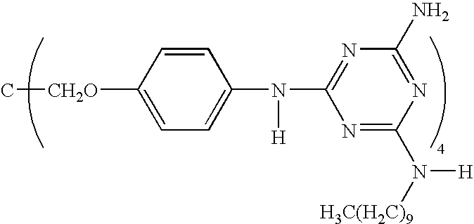 - QBFVJYCBAOFJHE-UHFFFAOYSA-N [H]N(CCCCCCCC)C1=NC(N)=NC(N(C2=CC=C(OCOC3=CC=C(N(C4=NC(N)=NC(N([H])CCCCCCCC)=N4)C4=NC(N([H])CCCCCCCC)=NC(N)=N4)C=C3)C=C2)C2=NC(N)=NC(N([H])CCCCCCCC)=N2)=N1 Chemical compound [H]N(CCCCCCCC)C1=NC(N)=NC(N(C2=CC=C(OCOC3=CC=C(N(C4=NC(N)=NC(N([H])CCCCCCCC)=N4)C4=NC(N([H])CCCCCCCC)=NC(N)=N4)C=C3)C=C2)C2=NC(N)=NC(N([H])CCCCCCCC)=N2)=N1 QBFVJYCBAOFJHE-UHFFFAOYSA-N 0.000 description 1