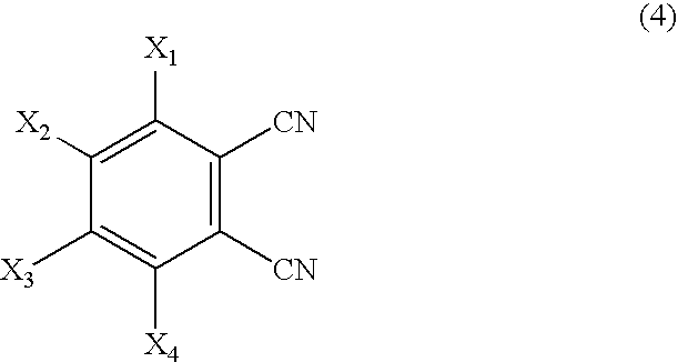 In the above formula (1), the symbol “M”, stands for a nonmetal, a metal, a metal oxide, or a metal halide. The term “nonmetal” as used herein means atoms other than metal atoms such as, for example, two hydrogen atoms. As typical examples of the metal, iron, magnesium, nickel, cobalt, copper, palladium, zinc, vanadium, titanium, indium, and tin may be cited. As typical examples of the metal oxide, titanyl and vanadyl may be cited. As typical examples of the metal halide, aluminum chloride, indium chloride, germanium chloride, tin(II) chloride, tin(IV) chloride, and silicon chloride may be cited. M is preferably a metal, a metal oxide, or a metal halide. More specifically, copper, zinc, cobalt, nickel, iron, vanadyl, titanyl, chloroindium, and tin(II) chloride are preferably used. More preferably, copper, vanadyl, and zinc are used.
