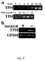 By suppression subtractive hybridization cloning (Diatchenko, L. et al. Suppression subtractive hybridization: a method for generating differentially regulated or tissue-specific cDNA probes and libraries. Proc Natl Acad Sci USA 93, 6025-6030. (1996)), we identified genes that were differentially expressed in mammary gland tissues from PRL-deficient (PRL−/−) mice (Horseman, N. D. et al. Defective mammopoiesis, but normal hematopoiesis, in mice with a targeted disruption of the prolactin gene. EMBO J 16, 6926-6935 (1997)) compared with mice made hyperprolactinemic by pituitary grafting (18 days), or with mice that were treated by implanting progesterone-containing pellets (25 mg, 18 days). Of the several genes identified as being PRL-dependent, 8 of an initial 25 clones that we sequenced encoded cDNA fragments for tryptophan hydroxylase (EC1.14.16.4, TPH) which catalyzes the first step in the conversion of tryptophan to serotonin (5-hydroxytryptamine, 5-HT). The sequence of the mammary-derived TPH cDNA was identical to that of the mouse TPH gene reported from a mastocytoma except for a 1 base difference in the 5′-untranslated region (Genbank accession number: AF273257).