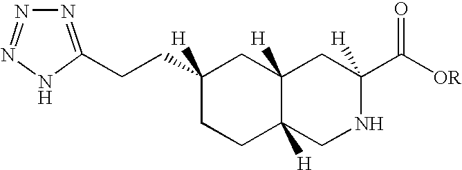 - the present invention relates to novel prodrug forms of (3S,4aR,6R,8aR)-6-[2-(1(2)H-tetrazole-5-yl)ethyl-1,2,3,4,4a,5,6,7,8,8a-decahydroisoquinoline-3-carboxylic acid, to pharmaceutical compositions containing the prodrug forms, and to methods of using the prodrug forms.