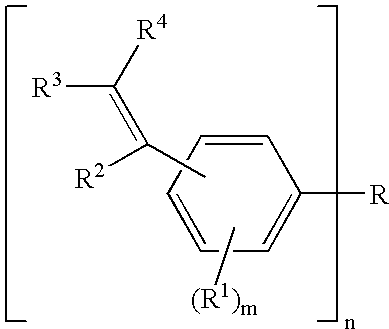 In the above formula, the substituted or unsubstituted vinyl group (R3)(R4)C═C(R2)— is preferably present in the position meta or para to R on the benzene ring.