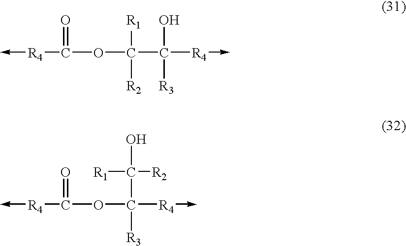 When such epoxidized fatty acids are used in a process for making polyesters according to the present invention, ring-opening polymerization of the epoxy group takes place by attack of the hydroxyl oxygen upon the epoxy group. However, this attack may occur at either of the epoxy carbon atoms. This results in a combination of two types of linked structures in the growing polyester chain (as well as in the polyester produced), as can be seen in the dimeric structures represented by formulas (31) and (32):