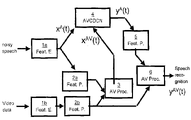 - an AVCDCN scheme in accordance with at least one embodiment of the present invention makes use of a front end that produces both a stream of audio-only feature vectors (the noisy features x A (t), the clean features y A (t)) or ⁇ A (t)) and a stream of audio-visual feature vectors x AV (t) for use in equation (4), (5), (6), (7), and (8),.