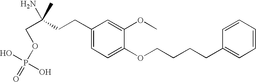 - GPYDVMGIVJGVCZ-JOCHJYFZSA-N [(2r)-2-amino-4-[3-methoxy-4-(4-phenylbutoxy)phenyl]-2-methylbutyl] dihydrogen phosphate Chemical compound COC1=CC(CC[C@@](C)(N)COP(O)(O)=O)=CC=C1OCCCCC1=CC=CC=C1 GPYDVMGIVJGVCZ-JOCHJYFZSA-N 0.000 claims description 3