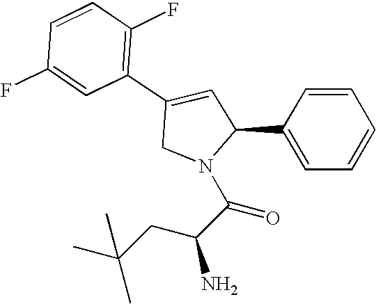 A solution of methyl N-{(1S)-1-cyclopropyl-2-[(2S)-4-(2,5-difluorophenyl)-2-phenyl-2,5-dihydro-1H-pyrrol-1-yl]-2-oxoethyl}-β-alaninate (40-1, 84 mg, 0.19 mmol, 1 equiv) and sodium hydroxide (1N, 0.57 mL, 0.57 mmol, 3.00 equiv) in t-BuOH (4 mL) was stirred at 23 deg C. for 4 h. The reaction mixture was concentrated and the residue was partitioned between brine adjusted to pH 4 with aqueous 1 N HCL solution and ethyl acetate (2×40 mL). The combined organic layers were dried over sodium sulfate and concentrated. A solution of the residue, morpholine (0.083 mL, 0.95 mmol, 5.0 equiv), 1-(3-dimethylaminopropyl)-3-ethylcarbodiimide hydrochloride (EDC, 73 mg, 0.38 mmol, 2.0 equiv), and 1-hydroxy-7-azabenzotriazole (52 mg, 0.38 mmol, 2.0 equiv) in DMF (2 mL) was heated at 50° C. for 20 h. The reaction mixture was partitioned between aqueous saturated sodium bicarbonate solution and ethyl acetate (2×30 mL). The combined organic layers were dried over sodium sulfate and were concentrated. The residue was purified by reverse-phase LC (H2O/CH3CN gradient w/0.1% TFA present) and the desired fractions partitioned between saturated sodium bicarbonate solution and ethyl acetate. The organic layer was dried over sodium sulfate and concentrated to provide N-{(1S)-1-cyclopropyl-2-[(2S)-4-(2,5-difluorophenyl)-2-phenyl-2,5-dihydro-1H-pyrrol-1-yl]-2-oxoethyl}-3-morpholin-4-yl-3-oxopropan-1-amine (41-2) as a white foam. LRMS m/z M+H) 496.5 found, 496.2 required.