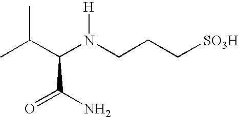 To a solution of L-valinamide (1.57 g, 13.5 mmol) in tetrahydrofuran (20 mL) was slowly added 1,3-propane sultone (1.61 g, 12.9 mmol). The mixture was stirred at reflux for 2 hours. The reaction mixture was cooled to room temperature. The solid material was collected by filtration, washed with acetone (2×25 mL). The crude product was dissolved in water (60 mL) and treated with ion exchange resin Dowex Marathon C (strongly acidic, 15 g). The mixture was stirred for 15 minutes. The resin was removed by filtration. The filtrate was poured into EtOH (250 mL). The solid product, after the completion of the precipitation, was collected by filtration, and dried in vacuo, to afford compound EQ (1.6 g, 51%). 1H NMR (D2O, 500 MHz) δ ppm 3.63 (d, 1H), 3.05 (m, 2H), 2.85 (m, 2H), 2.05 (m, 4H), 0.93 (d, 3H), 0.88 (d, 3H). 13C NMR (D2O, 125 MHz) δ ppm 170.24., 65.92, 48.16, 46.31, 29.59, 21.31, 18.02, 17.07. [α]D=+10.5° (c=0.0027 in water), ES-MS 237 (M−1).