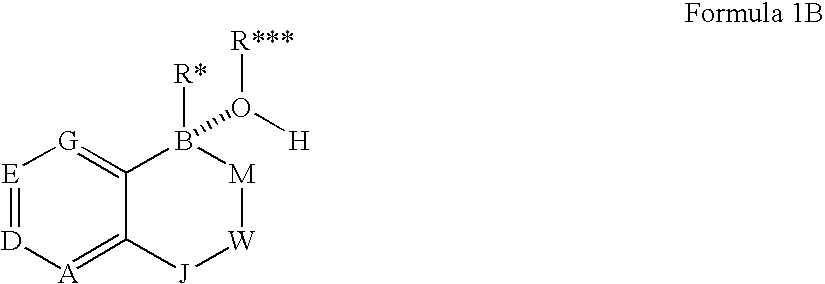 d) (4-(5(Fluorobenzo[c][1,2]oxaborol-1(3H)-yl)phenylmethanamine: The title compound was obtained from N,N-bis(methoxymethyl)-4-bromobenzylamine and 5-fluoro-2-[(methoxymethoxymethyl)phenyl]-[1,3,2]-dioxaboralane: 1H NMR (300 MHz, DMSO-d6) δ 3.72 (s, 2H), 5.29 (s, 2H), 7.15 (m, 1H), 7.3-7.5 (m, 3H), 7.96 (d, J=7.6 Hz, 1H), 8.11 (dd, J=8.2, 5.9 Hz, 1H): ESI-MS m/z 242 (positive); C14H13BFNO=241.