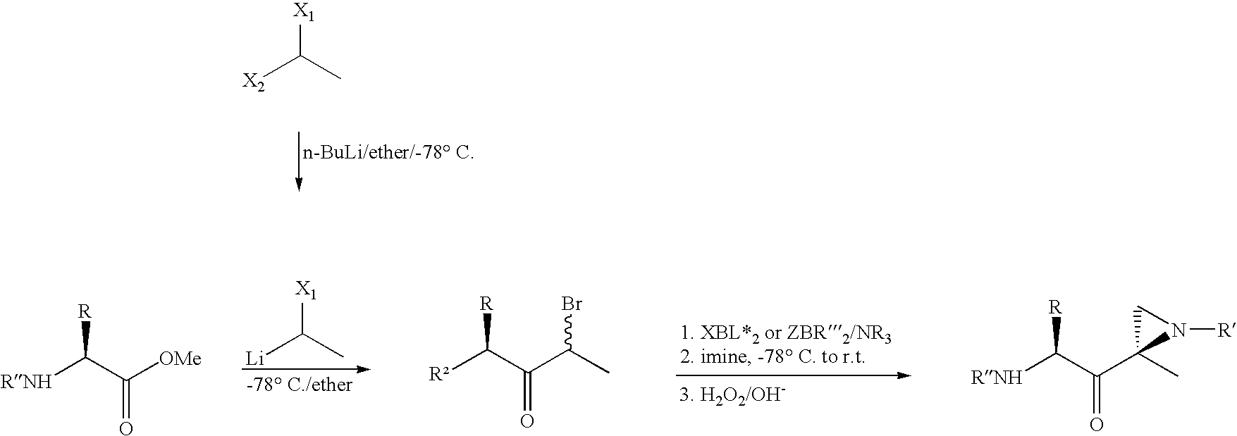 In yet another embodiment, an α′,β′-aziridine ring can be introduced by way of an enolate reaction, as follows. A peptide, protected at the carboxy terminus with an ester group, such as a branched or unbranched C1-6 alkyl ester, for example a methyl ester, is reacted with a halogenated alkylating agent. Such halogenated alkylating agents include, for example 1-halo-1-metalloalkanes, including 1-bromo-1-lithio-ethane. These reagents can be generated according to methods known in the art, such as by treating a dihalogenated alkane with an alkylating reagent such as n-butyllithium in a nonpolar, nonprotic solvent such as diethyl ether, at low temperature, for example −78° C. The reaction between the esterified peptide and the halogenated alkylating agent results in an α-haloketone, which is substantially racemic at the α carbon.