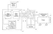 - Fuel system 14 may use electric power provided from power source 20 (typically a battery or the like), to provide electrical operating power to motor 22 and to the electrical components (motor controller 24 , signal conditioning module 26 , and possibly environmental noise transducer 28 ) used to control the speed of motor 22 .