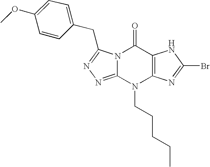 To a solution of N-[2-(7-bromo-5-oxo-9-pentyl-6,9-dihydro-5H-[1,2,4]triazolo[4,3-a]purin-3-yl)ethyl]-4-methoxybenzamide (63.0 mg, 0.125 mmol) in CH2Cl2 (5 mL) at 0° C. was added a solution of Boron tribromide in CH2Cl2 (1.0 M, 1.3 mL, 1.3 mmol). The mixture was stirred at room temperature overnight. The reaction mixture was quenched with water and then concentrated and purified by preparative LCMS to give the desired product. LCMS calculated for C20H23BrN7O3(M+H): m/z=488.1, 490.1; found: 488.0, 489.9.