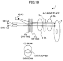 FIG. 10 illustrates an optical pickup having an LD unit and a PD unit arranged on the CD/DVD common optical path in which diffraction gratings for CD and DVD are also inserted;