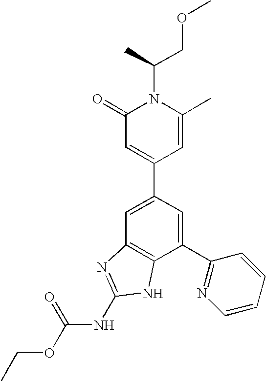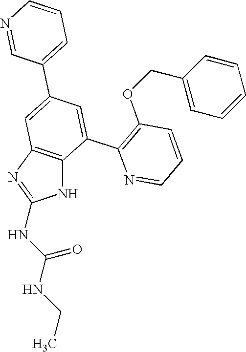 ATPase assays are carried out at 30° C. in buffered solutions containing 100 mM TRIS pH 7.6, 1.5 mM MgCl2, 150 mM KCl. The coupling system contains (final concentrations) 2.5 mM phosphoenol pyruvate, 200 μM nicotinamide adenine dinucleotide (NADH), 1 mM DTT, 30 ug/ml pyruvate kinase, and 10 ug/ml lactate dehydrogenase. 40 nanomolar enzyme (374 kDa Gyr A2B2 subunit from Staphylococcus aureus) and a DMSO solution of the inhibitor to a final concentration of 4% are added and the reaction mixture is allowed to incubate for 10 minutes at 30° C. The reaction is then started by the addition of ATP to a final concentration of 0.9 mM and the rate of NADH disappearance at 340 nanometers is measured over the course of 10 minutes. The Ki values are determined from rate versus concentration profiles.