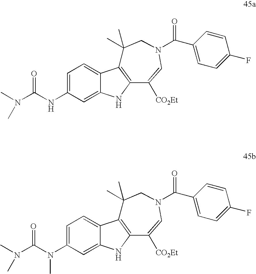 Representative data from these experiments are shown in FIGS. 1, 2 and 3 for the effect of Compound A (ethyl 3-(3,4-difluorobenzoyl)-1-methyl-1,2,3,6-tetrahydroazepino[4,5-b]indole-5-carboxylate), Compound B (Ethyl 3-(3,4-difluorobenzoyl)-1,1-dimethyl-1,2,3,6-tetrahydro-azepino[4,5-b]indole-5-carboxylate) and Compound C (isopropyl 3-(3,4-difluorobenzoyl)-1,1-dimethyl-1,2,3,6-tetrahydroazepino[4,5-b]indole-5-carboxylate).