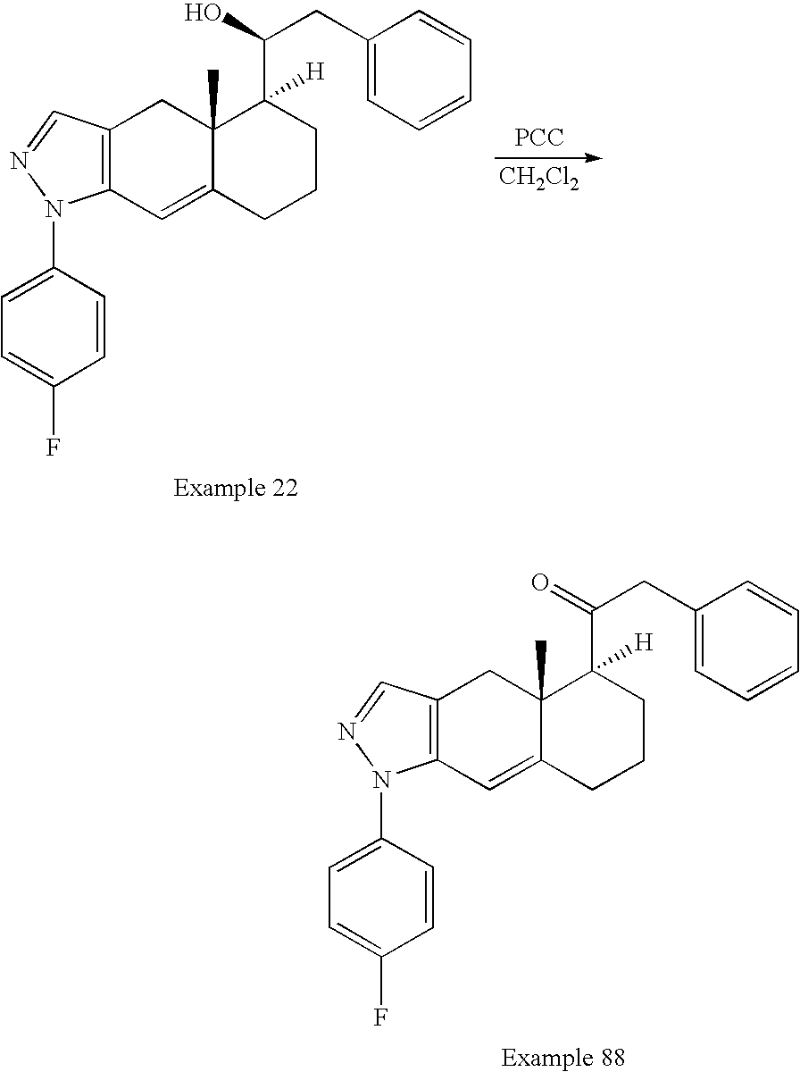 1,2 Phenylenediamine (10.5 mg, 0.097 mmol) and aldehyde B (15.0 mg, 0.05 mmol) were placed in a flask under nitrogen. Nitrobenzene (500 μL) was added, and the reaction was heated to 150° C. The reaction was stirred at 150° C. for 4 hours. After cooling to room temperature, the reaction was loaded directly onto silica gel and the column was eluted with 100% hexanes to remove the nitrobenzene, followed by 40 to 80% EtOAc/hexanes to afford a mixture of the desired product and some minor impurities. Further purification by PTLC (2/98 MeOH/CH2Cl2) gave 16.0 mg (84%) of example 174: Rf=0.19 (40% EtOAc/hexanes). LCMS=399; (M+1)+. 1H NMR (CDCl3, 500 MHz): δ 7.55 (s, 1H), 7.39 (m, 2H), 7.26 (s, 1H), 7.20 (m, 2H), 7.11 (t, J=8.5 Hz, 3H), 6.14 (s, 1H), 3.19 (m, 1H), 2.88 (d, J=15.5 Hz, 1H), 2.63 (d, J=15.5 Hz, 1H), 2.40 (m, 2H), 2.21 (m, 2H), 1.94 (m, 2H), 1.44 (m, 1H), 1.21 (s, 3H).