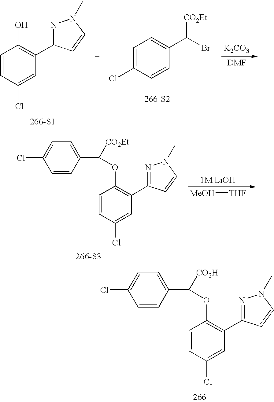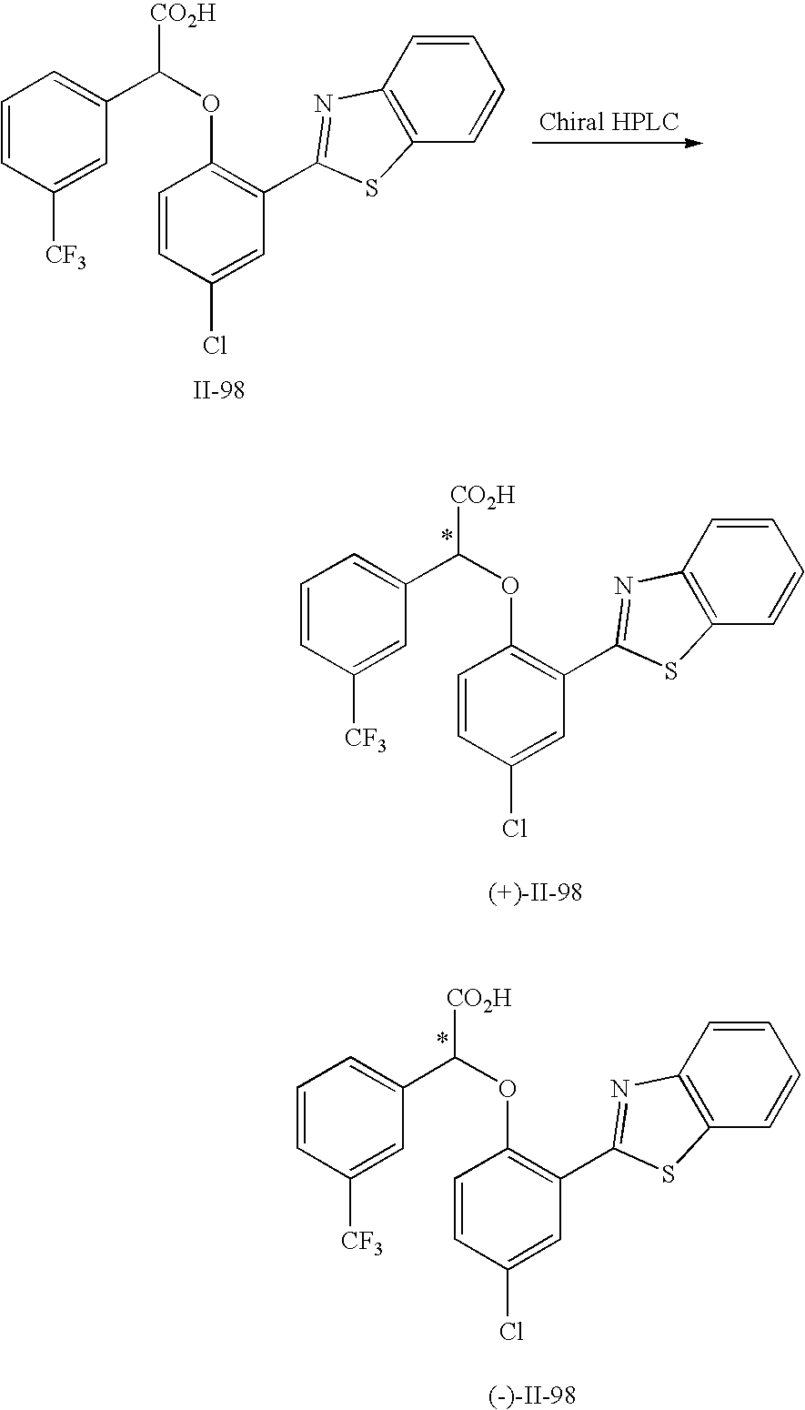 FIG. 6 illustrates the anti-diabetic effects of selected compounds of the present invention. Table 15 provides the relative potency of some of these selected compounds. Compounds that are effective for glucose lowering at the dose of ≧125 mg/kg are assigned a potency of +; compounds that are effective for glucose lowering at a dose of >25 mg/kg but <125 mg/kg are assigned a potency of ++; compounds that are effective for glucose lowering at a dose of ≦25 mg/kg are assigned a potency of +++. For example, a compound at 25 mg/kg that lowered the animal glucose level from 400 mg/dL (vehicle group value) to 250 mg/dL, is assigned the potency of +++.