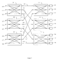 The intermediate circuits 230-232, 233-235, and 236-238 connect each of the first set of cross connect circuits 201-203 with each of the second set of cross connect circuits. The intermediate paths are connected to the second set of cross connect circuits in the following manner. The first intermediate paths 230, 233 and 236 connect to the first of the second set of cross connect circuits 211. The second intermediate paths 231, 234, and 237 from each of the first set of cross connects connect to the second of the second set of cross connect circuits 212. The third intermediate paths 232, 235, and 238 from each of the first set of cross connects connect to the third of the second set of cross connect circuits 213. One skilled in the art will note that any data path 220-228 can be connected through first set of cross connect circuits 201-203 to any of second set of cross connect circuits 211-213 by connecting the data path to the proper intermediate path 230-238.