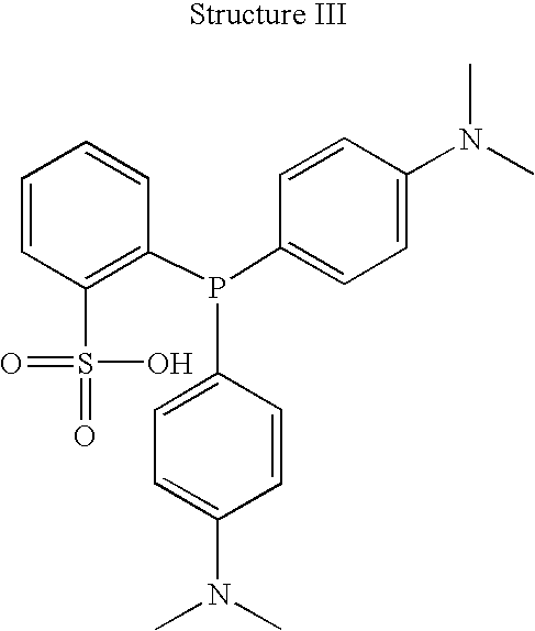 A separate 500 mL flask (“Flask C”) was purged and filled with nitrogen. Flask C was then charged with ˜200 mL of THF and 2′-Bromo-2′,6′-diisopropoxybiphenyl (8.66 g., 24.8 mmol). Flask C was then placed in a dry ice/acetone bath and allowed to cool with agitation to about −78° C. 10.03 mL of 2.5 molar n-BuLi was added to Flask C and allowed to react for about 10 minutes. The contents of Flask B were then transferred to Flask C, maintained at −78° C., using a cannula with continued vigorous agitation. Following the complete addition of the contents of Flask B into Flask C, Flask C was allowed to warm to room temperature for 45 min. The contents of Flask C were then poured into a 1000 mL recovery flask (Flask D) and the THF was removed, leaving a solid. The solid in Flask D was then mixed with ˜150 mL of distilled water and then transferred to a separation flask (Flask E). 100 mL of Methylene Chloride (CH2Cl2) was added to the contents of Flask E. Flask E was shaken to mix the two layers. About 20 mL of concentrated HCl was then added to Flask E and was shaken again. ˜20 mL of 3A alcohol was added to Flask E and was shaken again. The mixture in Flask E was then allowed to settle, forming two layers—an organic phase on the bottom and an aqueous phase on the top. The organic layer was collected. The aqueous phase was washed with 50 mL of CH2Cl2. The organic wash material was collected and added to the previously collected organic layer material. The combined organic material was then contacted with Magnesium Sulfate and rotovaped to dryness, leaving a solid. The solid was then washed with THF and diethyl ether to remove impurities. Approximately 2 g. of the washed product solid 2-[Bis-(2′,6′-Diisopropoxy-biphenyl-2yl)-phosphanyl]-toluene sulfonic acid was collected by filtration.