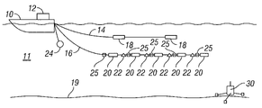 - a survey vessel 10 moves along the surface of a body of water 11 such as a lake or the ocean.