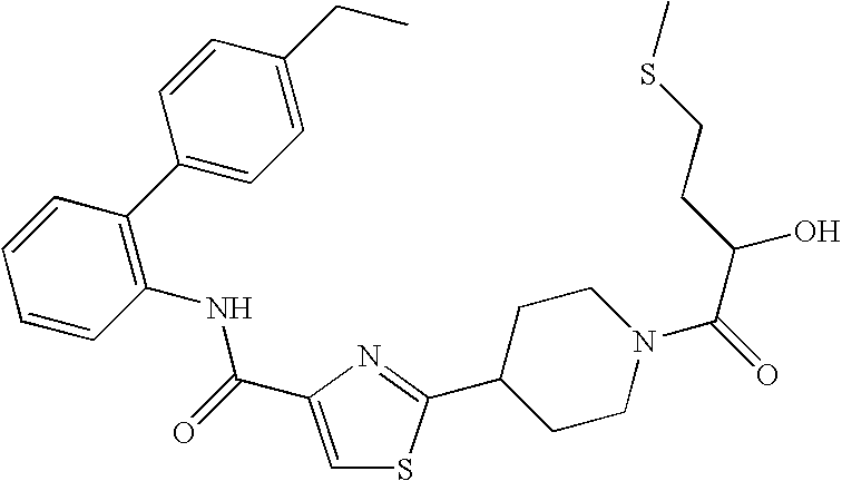 - ICZCSXGNTIVTLP-UHFFFAOYSA-N CC(NC(=O)C1=CSC(C2CCN(C(=O)C3=CC=CC=C3C3=CC=C(C(F)(F)F)C=C3)CC2)=N1)C(O)C1=CC=CC=C1 Chemical compound CC(NC(=O)C1=CSC(C2CCN(C(=O)C3=CC=CC=C3C3=CC=C(C(F)(F)F)C=C3)CC2)=N1)C(O)C1=CC=CC=C1 ICZCSXGNTIVTLP-UHFFFAOYSA-N 0.000 description 2