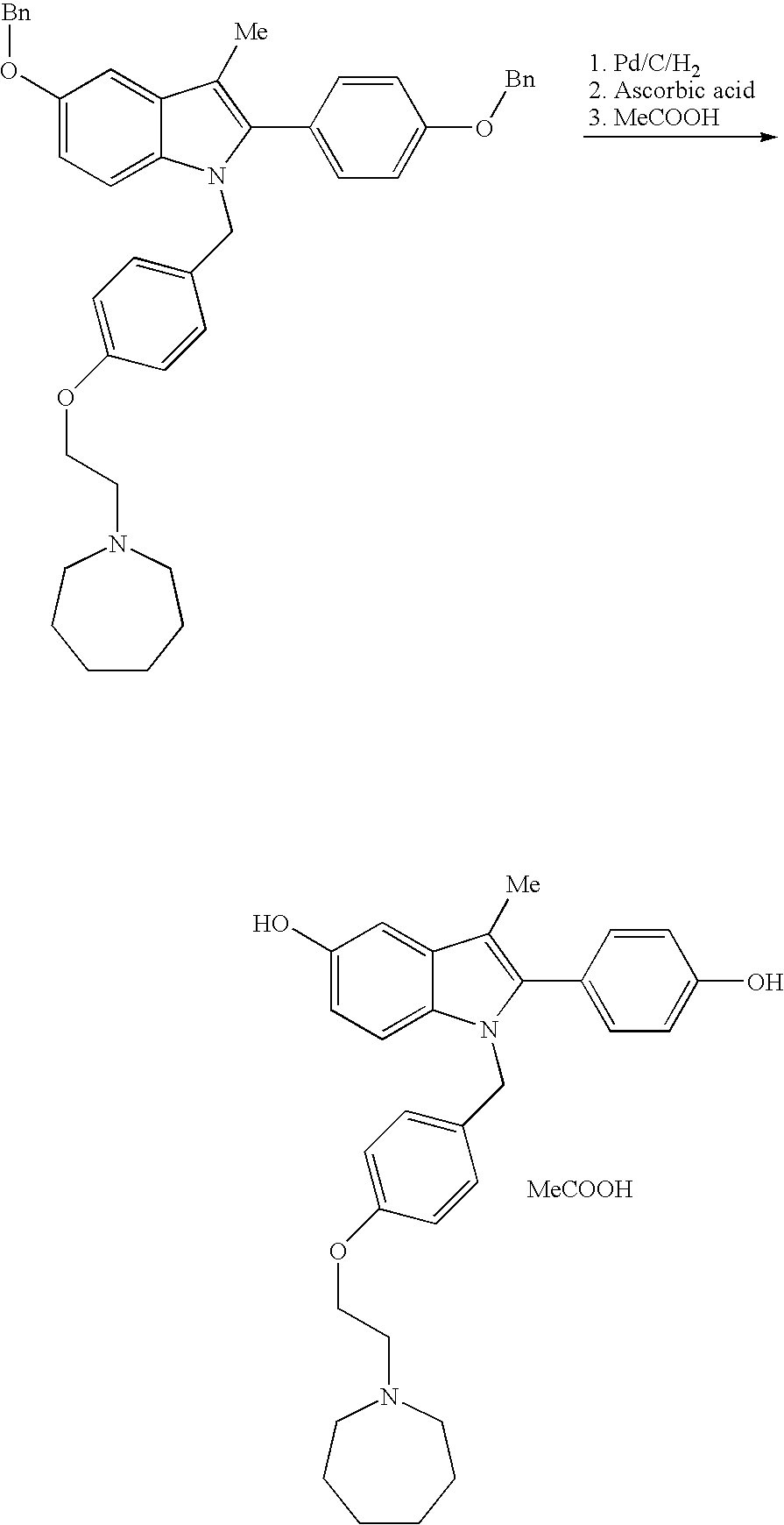 - OMZAMQFQZMUNTP-UHFFFAOYSA-N acetic acid;1-[[4-[2-(azepan-1-yl)ethoxy]phenyl]methyl]-2-(4-hydroxyphenyl)-3-methylindol-5-ol Chemical compound CC(O)=O.C=1C=C(OCCN2CCCCCC2)C=CC=1CN1C2=CC=C(O)C=C2C(C)=C1C1=CC=C(O)C=C1 OMZAMQFQZMUNTP-UHFFFAOYSA-N 0.000 title claims abstract description 154