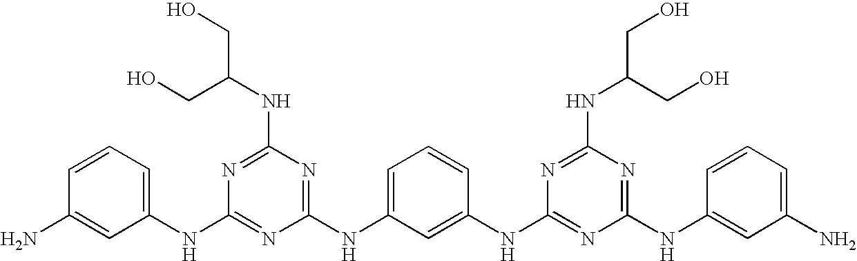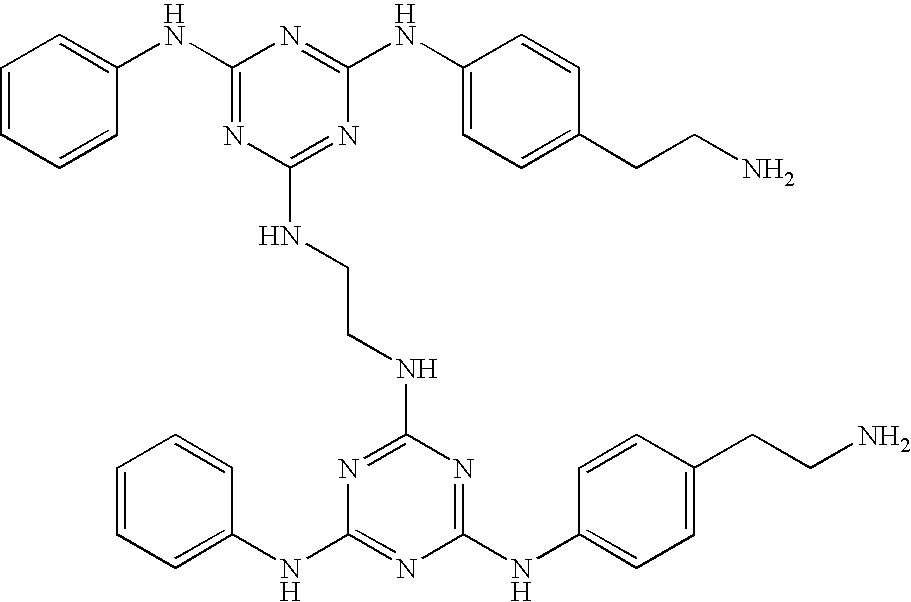 In an alternative embodiment of the invention, no phenyl group is present in the organic linker which connects the two disubstituted triazine rings, or B=0. That is, the triazine dimers are connected by an alkyl chain. Thus, for example, another preferred aspect of this invention is A=C=—CH2— and B=0. Therefore, the organic linker contains a —CH2CH2— or ethylene group and the general formula becomes: