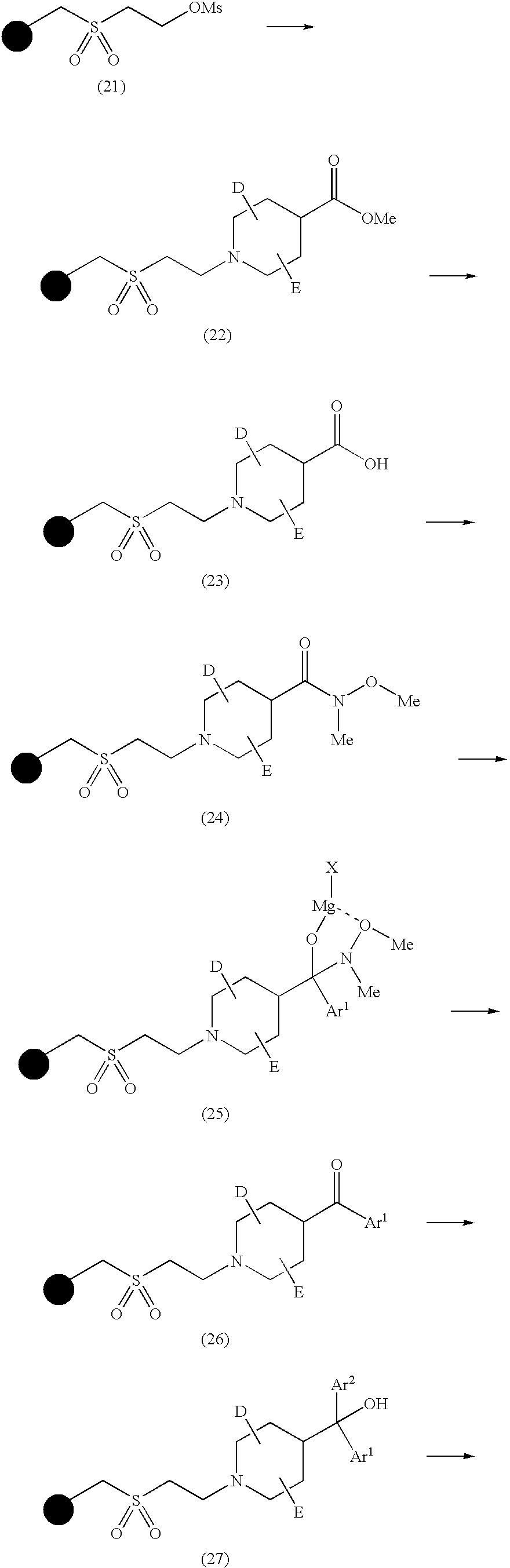 D, E, Ar1, Ar2 and Q1 have the same definitions as in the reaction scheme 1. A compound (21) synthesized by deriving from a Merrifield resin according to the method described in a reference (Kroll, F. E.; Morphy, R.; Rees, D.; Gani, D. Tetrahedron Lett. 1997, 38, 8573-8576) is allowed to react with a methyl isonipecotate derivative or the like to obtain a compound (22), which is subjected to ester hydrolysis using a base such as LiOH or the like, thereby obtaining a compound (23). After that, the compound (23) is subjected to a condensation reaction using N,O-dimethylhydroxylamine or the like, a condensing agent such as DIC or the like, and a condensing aid such as HOAt or the like, so that a compound (24) is obtained. Thereafter, the compound (24) is reacted with a Grignard reagent to obtain a compound (25). The compound (25) is then treated with acetic acid or the like to obtain a compound (26). The compound (26) is reacted with a Grignard reagent (26) which may be the same or different from the one as used before to obtain a compound (27). The compound (27) is allowed to react with an alkyl halide or the like in a solvent such as NMP, DMF or the like, thereby obtaining a compound (28). The compound (28) is treated overnight under basic conditions, for example, using ammonia gas, so that a compound is separated from the resin by Hofmann elimination. The compound thus obtained is eluted using a solvent such as acetonitrile, dichloromethane or the like, so that a compound (29) can be obtained. Alternatively, the compound (29) can be obtained by reacting overnight the compound (28) and a solution prepared by dissolving lithium hydroxide in a mixed solvent of THF and water. Further, by inducing beta-elimination based on the method shown in the reaction scheme 1, piperidine derivative according to the present patent application can be obtained from the compound (29).