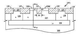 Though the junctions between first and second anodes 145A and 145B and graded cathode 115 are shown at the surface of substrate 100, the actual location of the PN-junction between the anodes and the graded cathode region may occur above or below the plane defined by the top surface of substrate 100. The dopant profile of varactor 105D is illustrated in FIG. 11 and described infra.