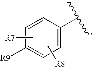 wherein the zig-zag mark shows the point of attachment to the parent molecule, and R7 is —H and R8 is —H, and R9 is isopropyl, tertbutyl, or trifluoromethyl.