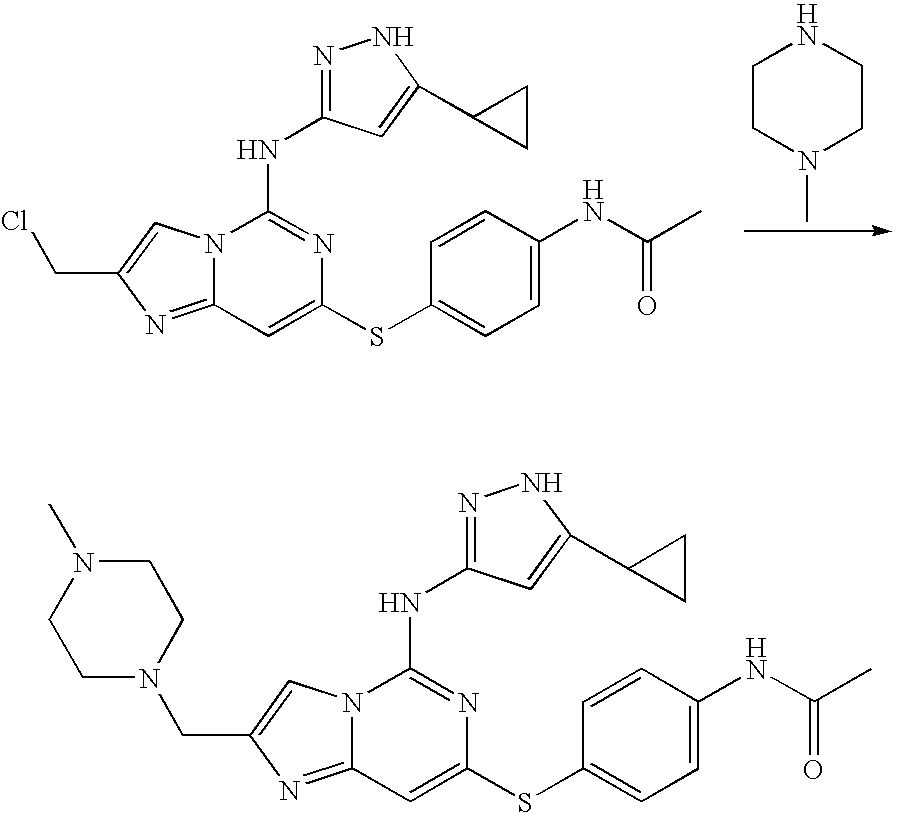 1H NMR (400 MHz, CD3OD) 8.23 (m, 1H) 8.16 (m, 1H) 8.06 (s, 1H) 7.72 (s, 1H) 7.61-7.64 (m, 2H) 6.54 (s, 1H) 3.15 (s, 3H) 2.56 (s, 3H) 2.39 (s, 3H) 2.38 (s, 3H). [M+H] calc'd for C22H23N8S, 431; found, 431.